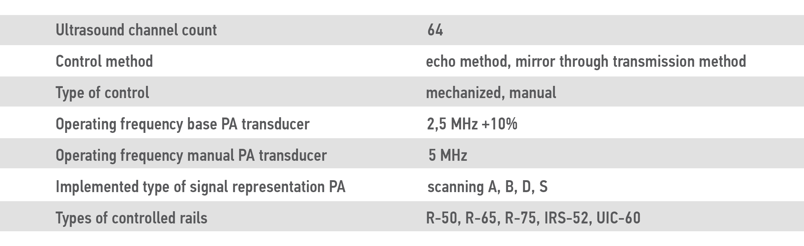 DUBLE-CUT RAIL ULTRASONIC PHASED ARRAY FLAW DETECTOR (PA) Double-line ultrasonic rail flaw detector on phased arrays (PAUT) for continuous ultrasonic testing of all types rail threads (R50, R65, R75, UIC52, UIC60, etc.) along the entire length and cross-section; rails turnouts with semi-automatic decoding of defects, including testing of rail base blades.