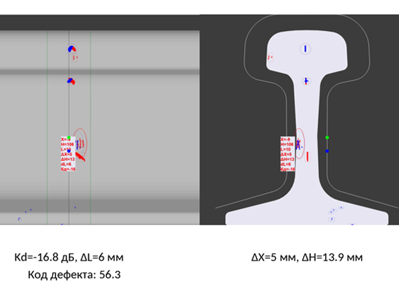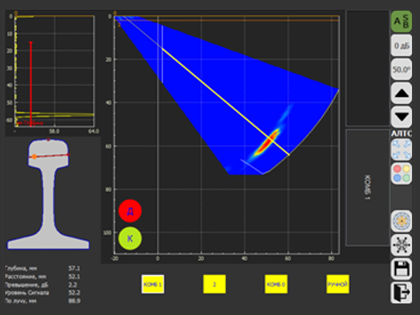 In real time, a B scan can be seen on the flaw detector screen as a rail contour with defect parameters: coordinates, location in the weld section, conventional dimensions, detectability coefficient. Detailed analysis of all signals is available in A and S scans.
